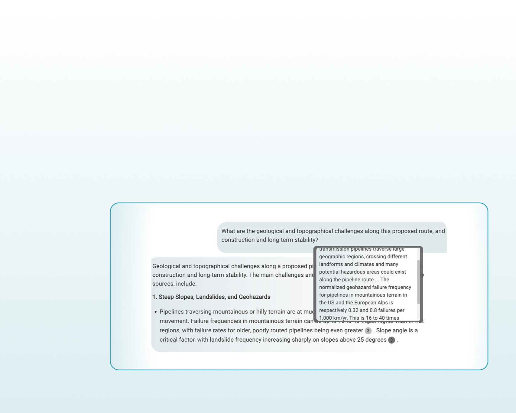 Instantly reference applicable federal regulations (like 49 CFR Parts 190–199) alongside your knowledgeBases and BCAi’s Partner’s technical knowledgeBases.